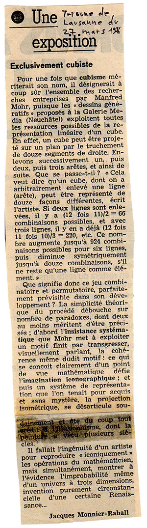 | "Manfred Mohr - Dessins Génératifs", Galerie Media, Neuchâtel , Switzerland, 18 Feb - 21 March, 1976:
