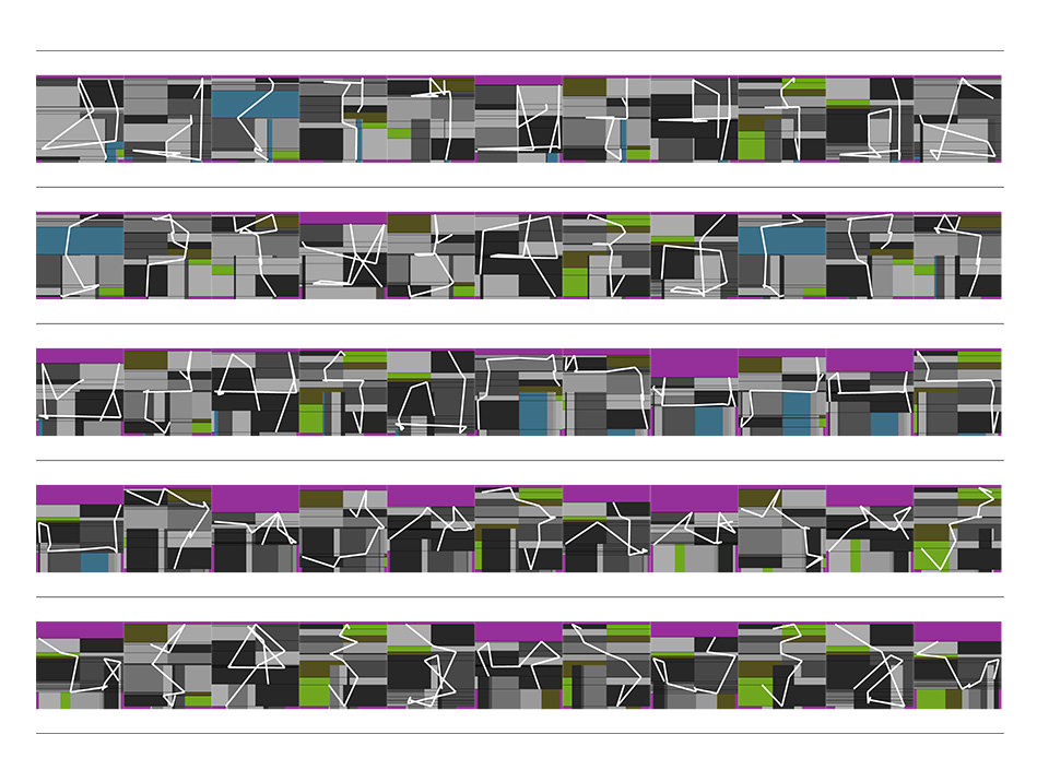 drawing depicts all the 2-D projections of a chosen n-dimensional diagonal-path. The series consists of 12 digital drawings 40x50cm, one for each dimension between 2-D and 13-D. |